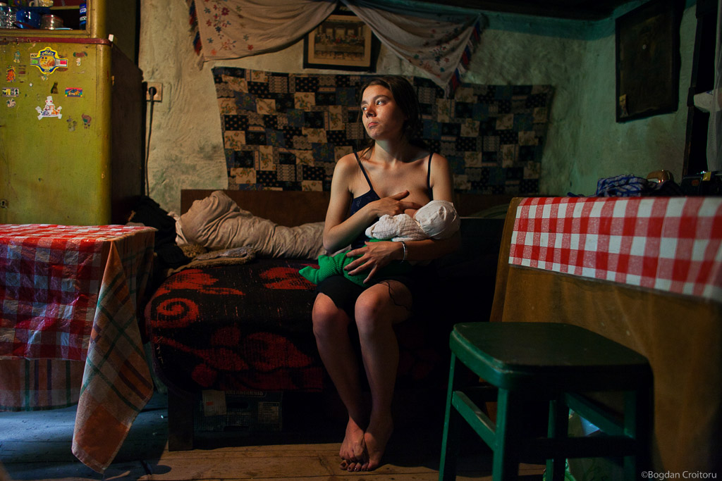 Young Cristina breastfeeds in her modest adobe made house where she lives with her mother in Viscri (Weisskirsch). In 1930, out of 787 inhabitants, 562 were Saxons in Viscri. Now there are about 400 Gypsies, 150 Romanians and less than 30 Saxons.