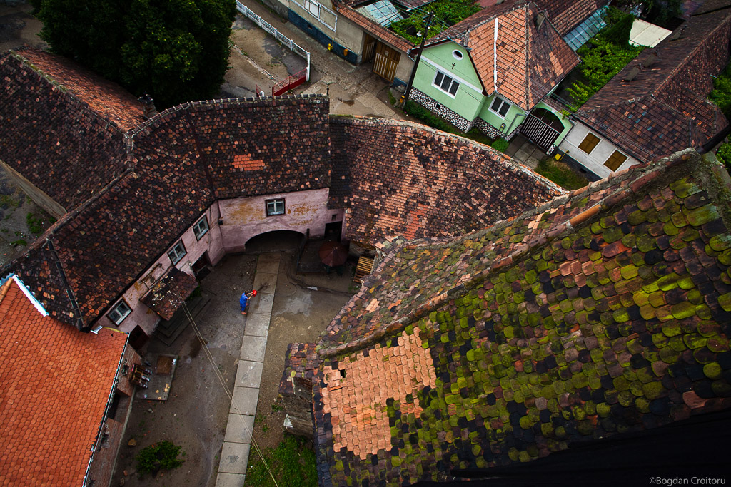 The housekeeper of Axente Sever (Frauendorf) church spreads the water in the yard after a strong rain. The 14th century fortified construction is now restored and can host visitors in its outbuildings.