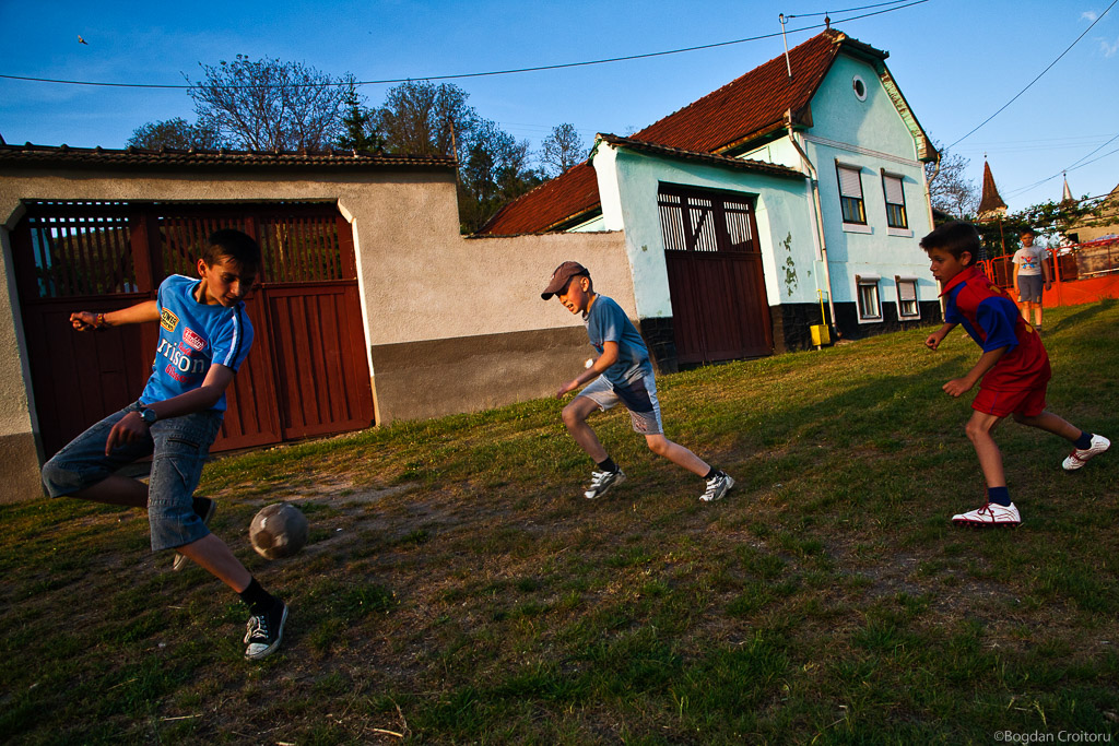 Children play football in front of their Transylvanian styled houses in Axente Sever (Frauendorf) village. In Axente Sever 70% of the population is Romanian and 30% Gypsy. Less than 10 people remain from the Saxon community, about 1700-strong in the early ‘90s.