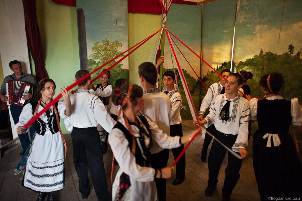 A traditional music assembly performs a Saxon dance in the Cultural Center, during the Flemish Days Festival in Cisnadioara, near Sibiu.
