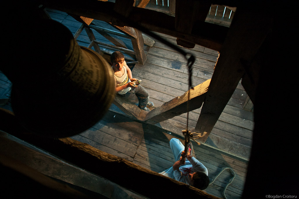 A boy rings the bell of the Axente Sever (Frauendorf) 14th century fortified church while his friend comforts a pigeon dazed by the sound. They regularly help the keykeeper with the daily jobs in the church.