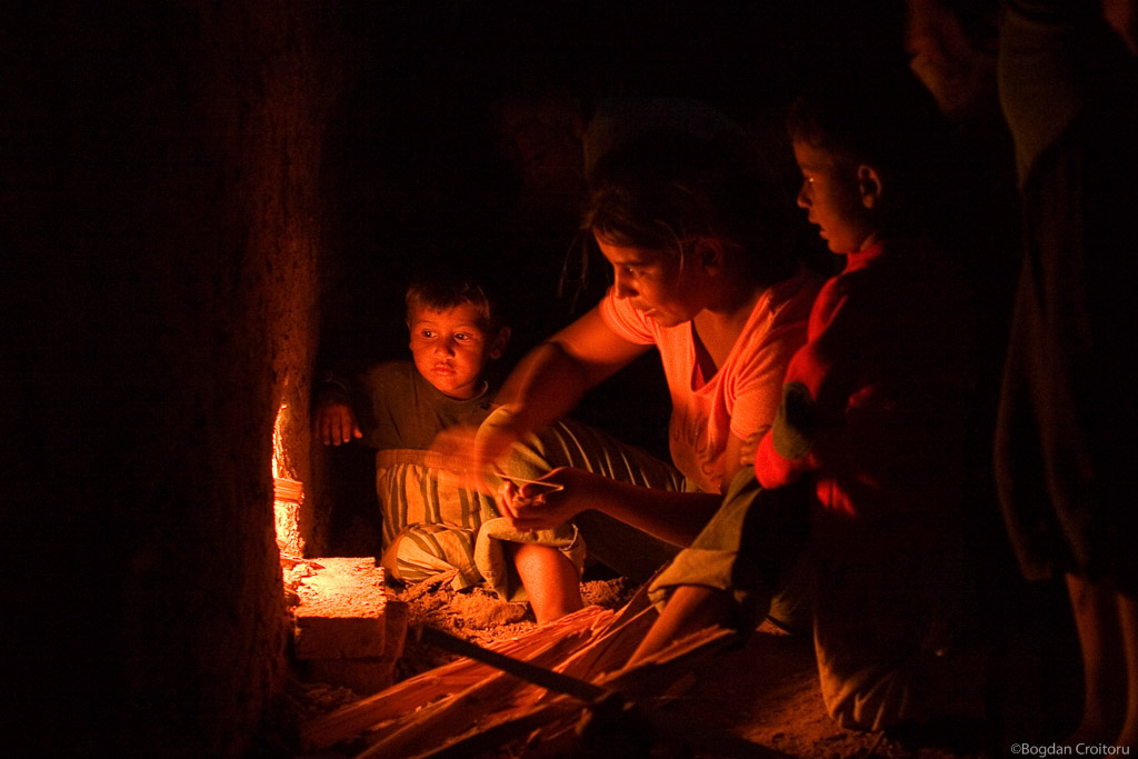 Magdalena checks the charcoal fire intensity in the bricks furnace at Islaz.
